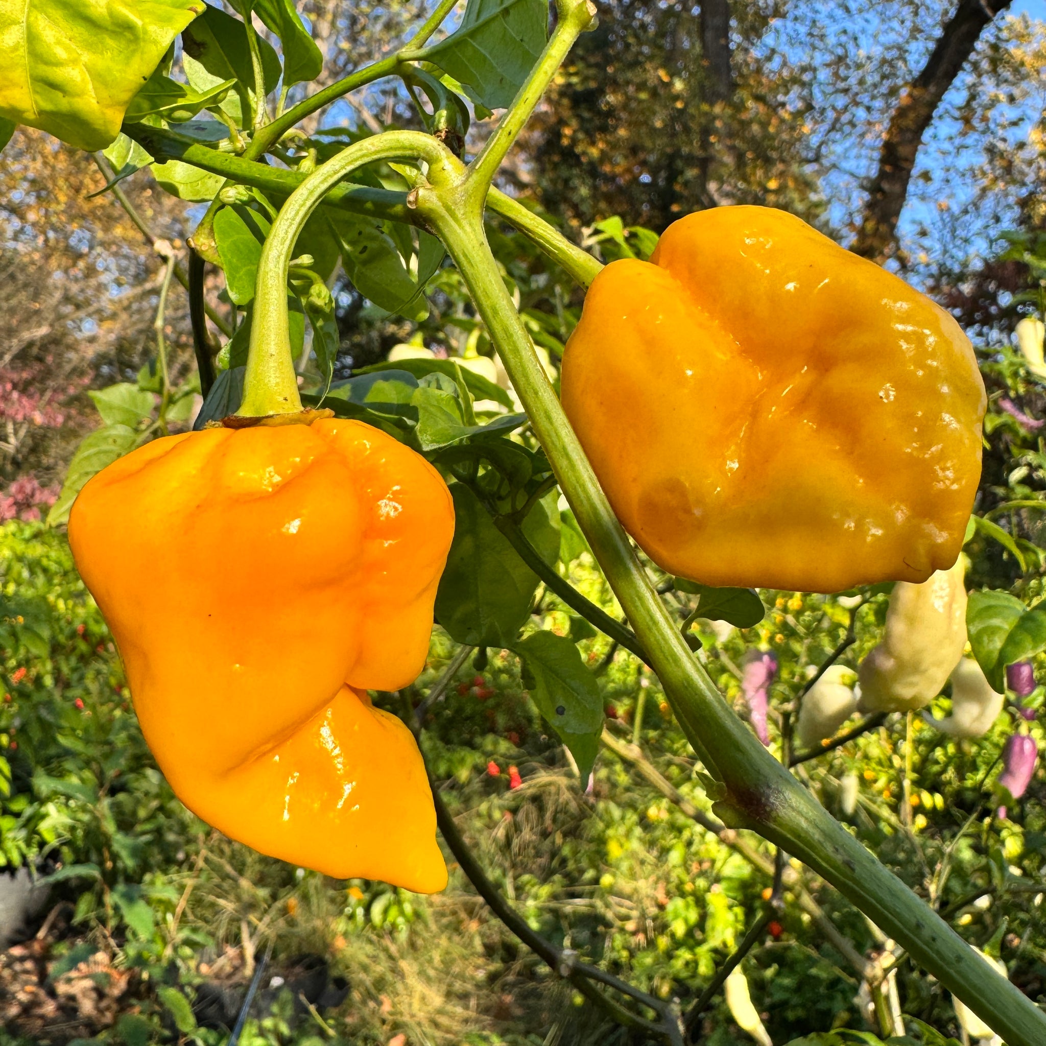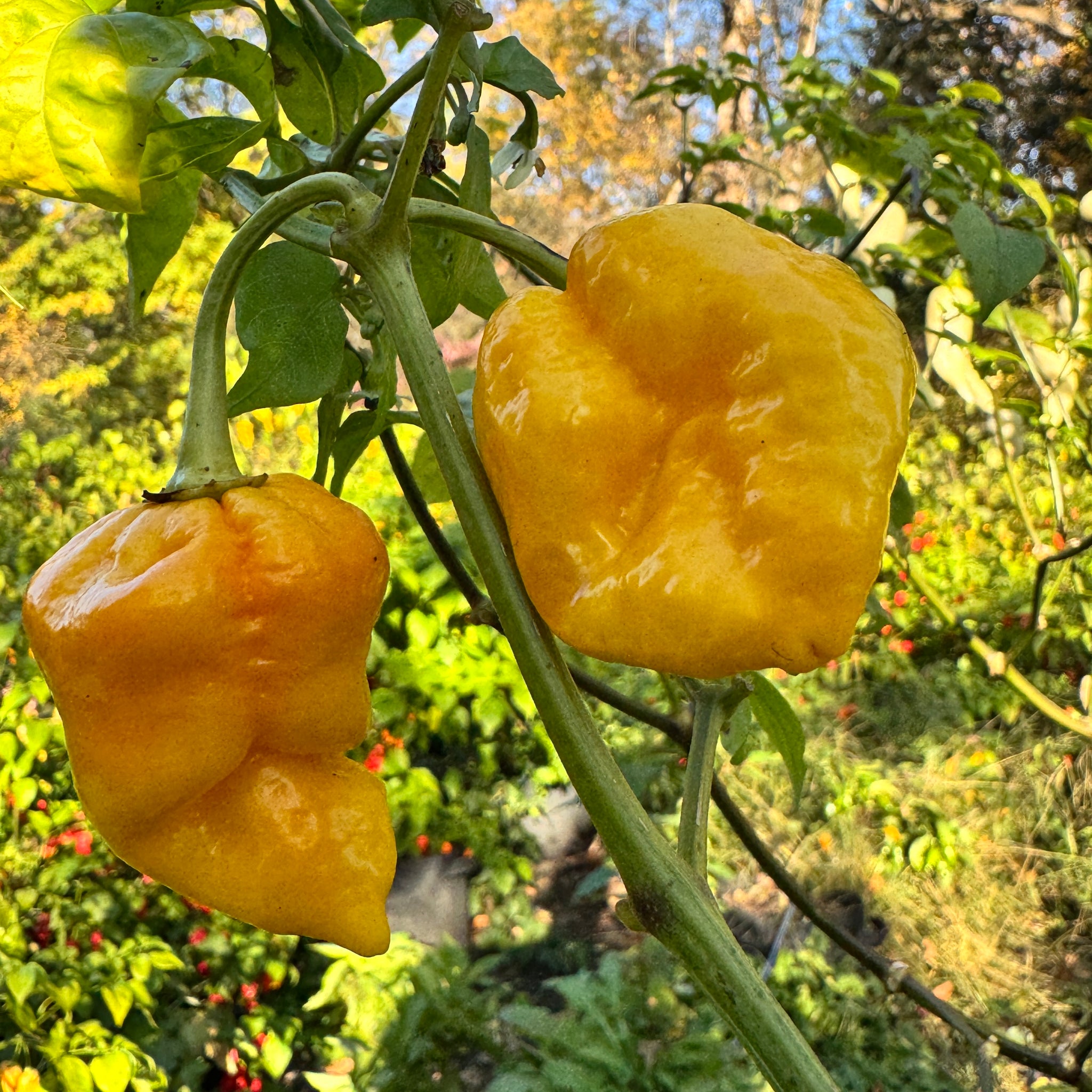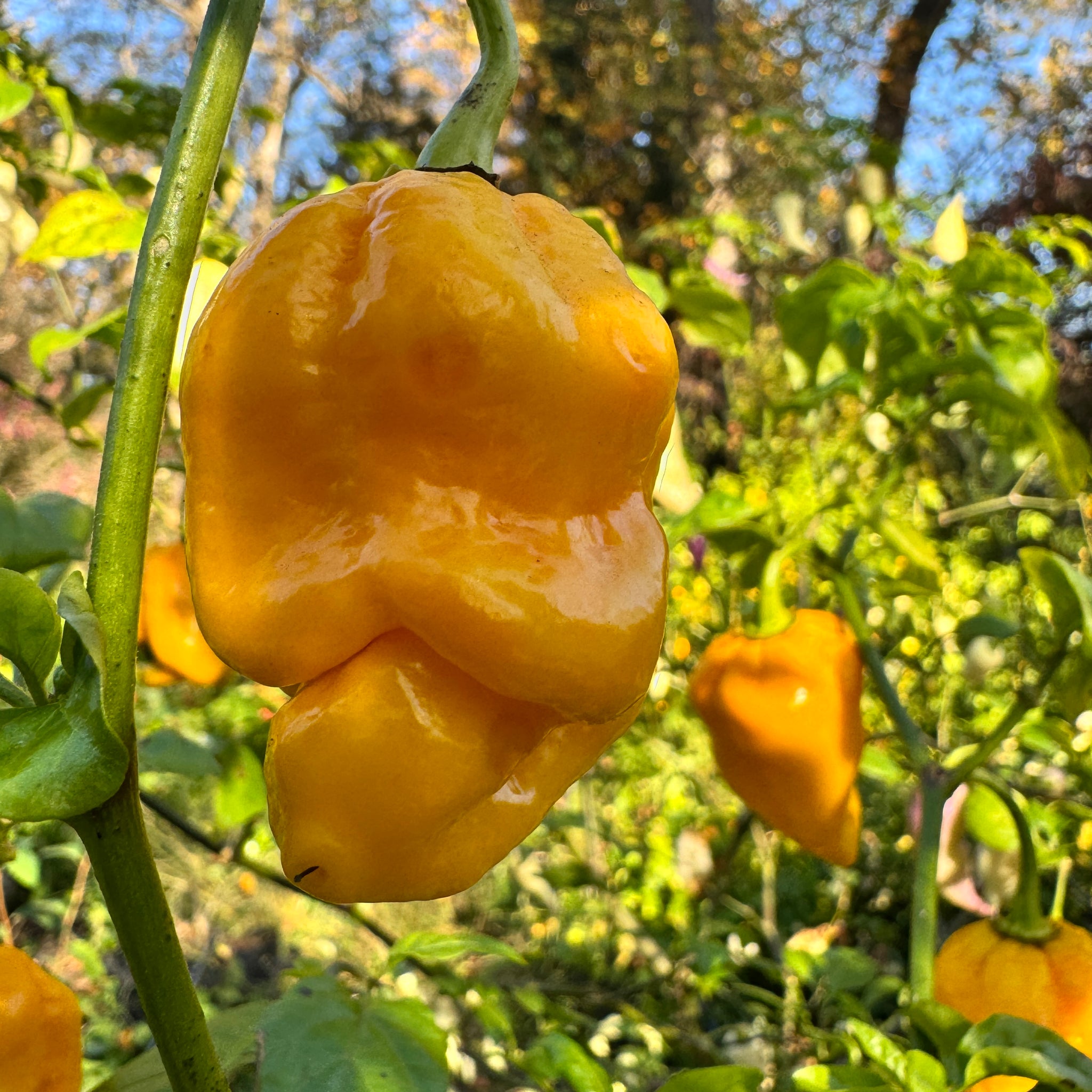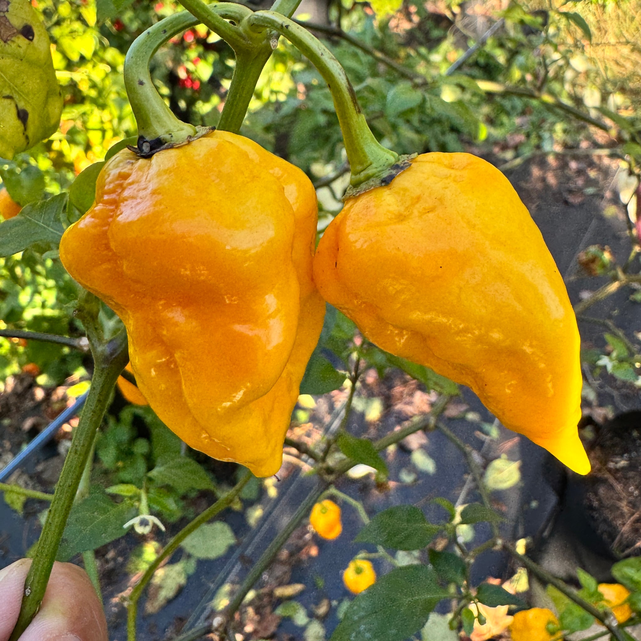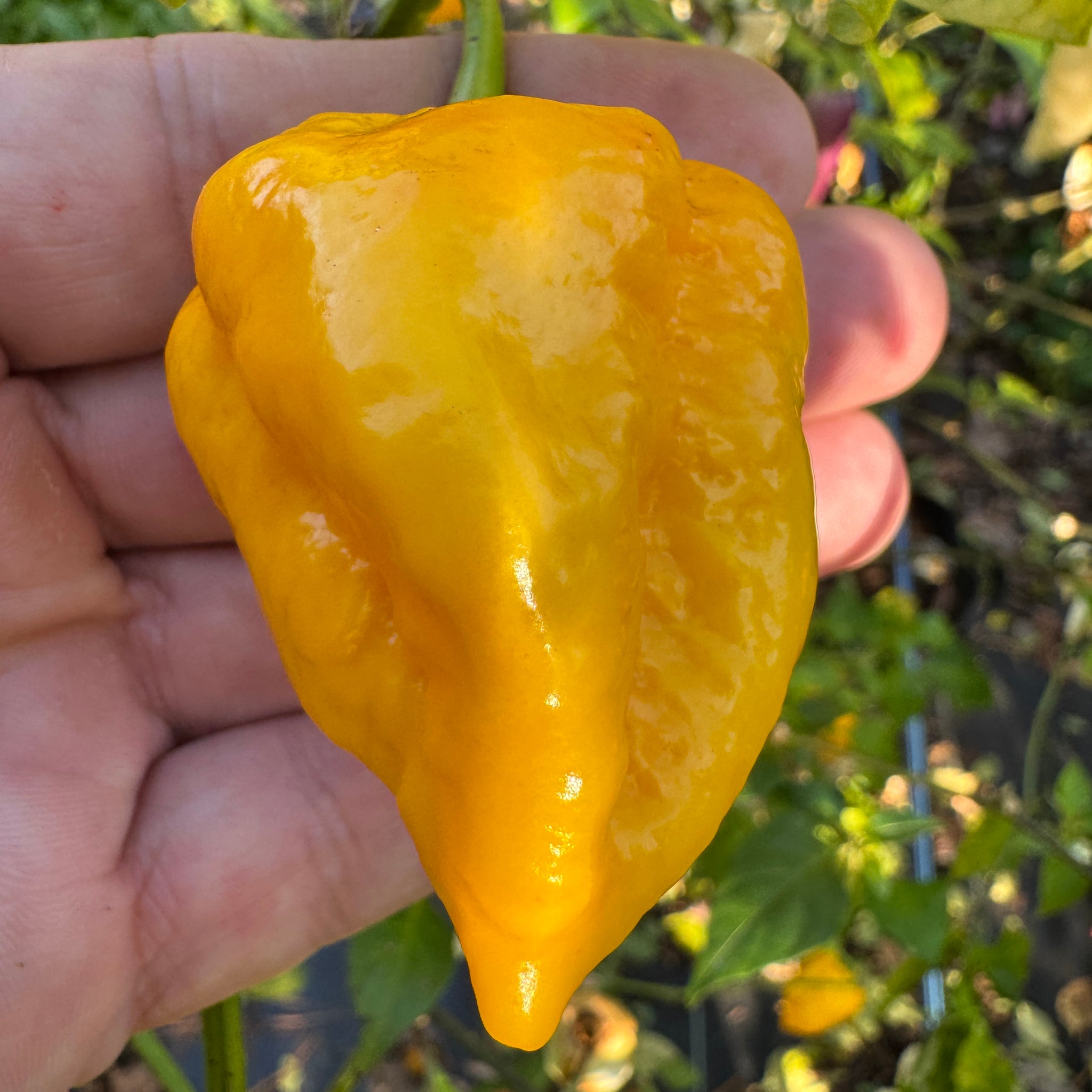 The Jigtali is a bold yellow superhot born from a cross between Jigsaw and Fatalii—two peppers famous for heat and wild pod shapes. This variety produces large, elongated fruits with a wrinkled, brainy surface and a vibrant golden color that stands out on the plant. Expect a sharp, citrus-forward flavor wrapped in intense heat, true to its Fatalii lineage, while the Jigsaw parent contributes to the pod size and gnarly texture. Plants are productive and eye-catching, making the Jigtali a great choice for growers who love unique yellow superhots with serious punch.