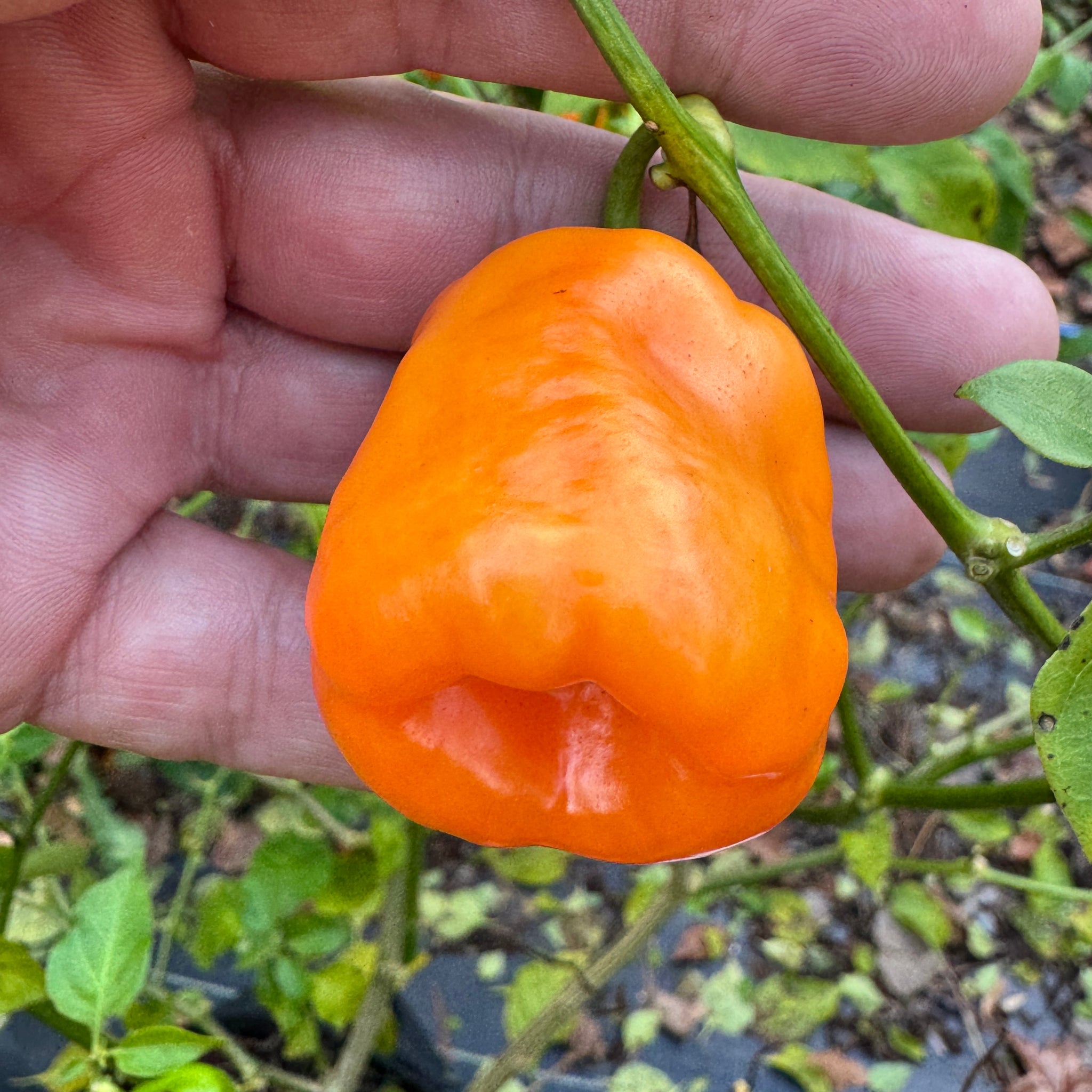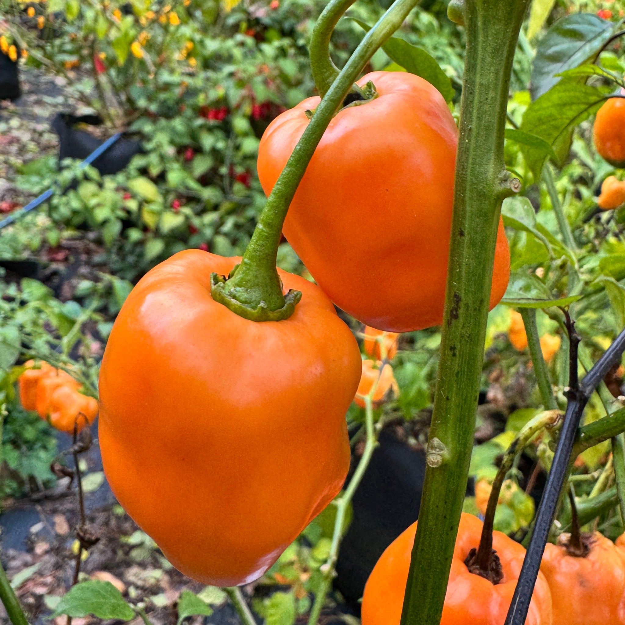 The Georgia Peach is a striking peach-orange chinense variety known for its thick flesh, large pod size, and naturally sweet flavor. Originating as a peach-colored offshoot of an Aji Margariteño, it delivers a mild-to-medium habanero-style warmth without overpowering heat. Pods often grow larger than a golf ball and have a juicy, fruity taste that works beautifully in sauces, fresh dishes, and stuffed pepper recipes. Plants are tall and vigorous—regularly topping 5 feet—and their heavy yields typically require staking for support.