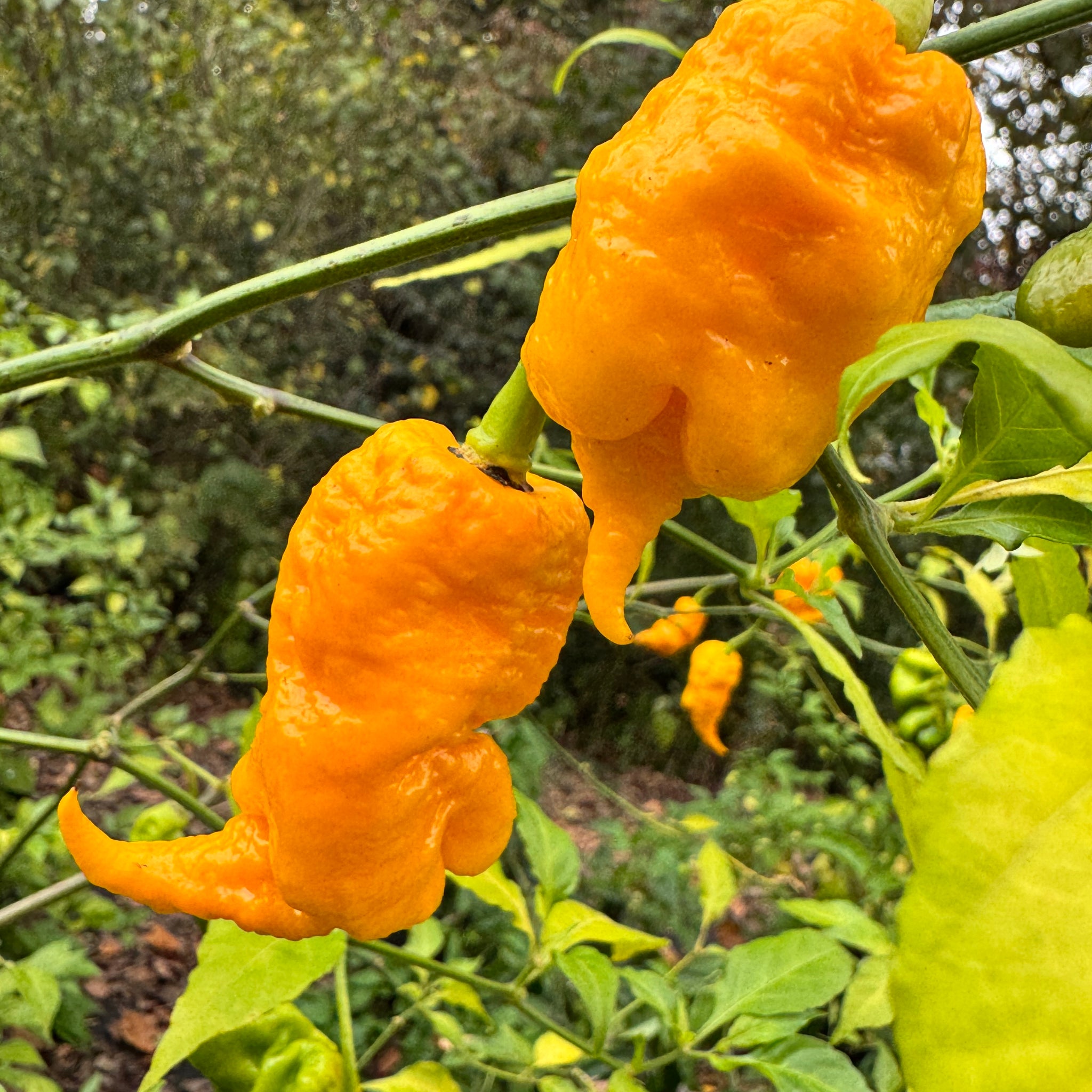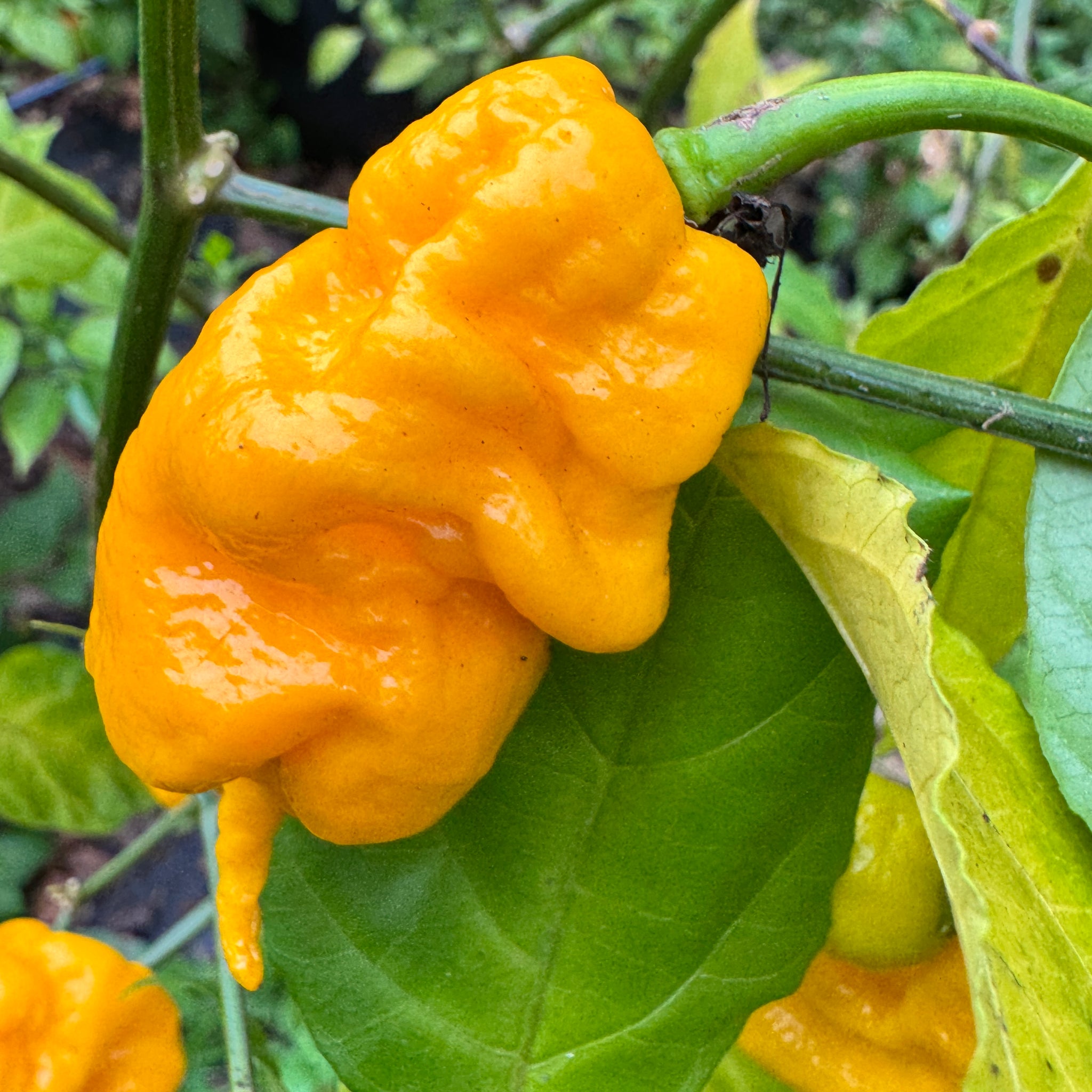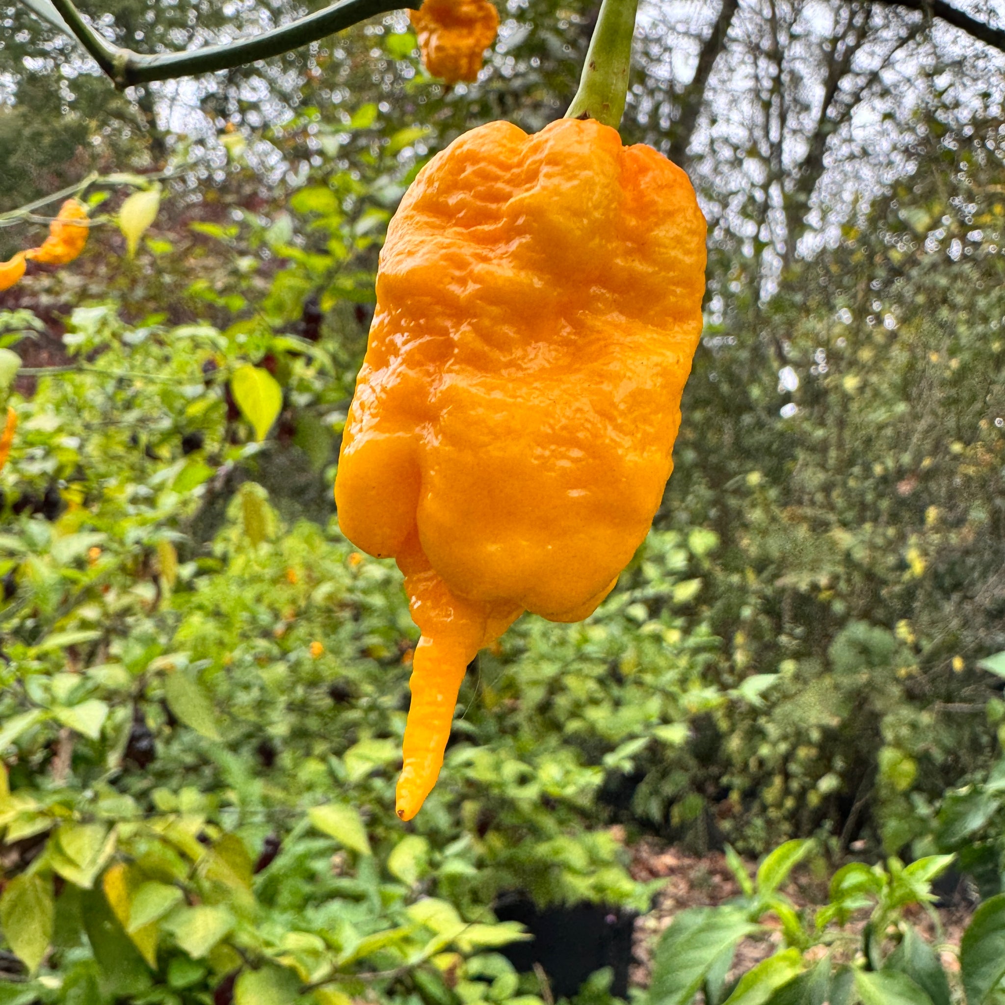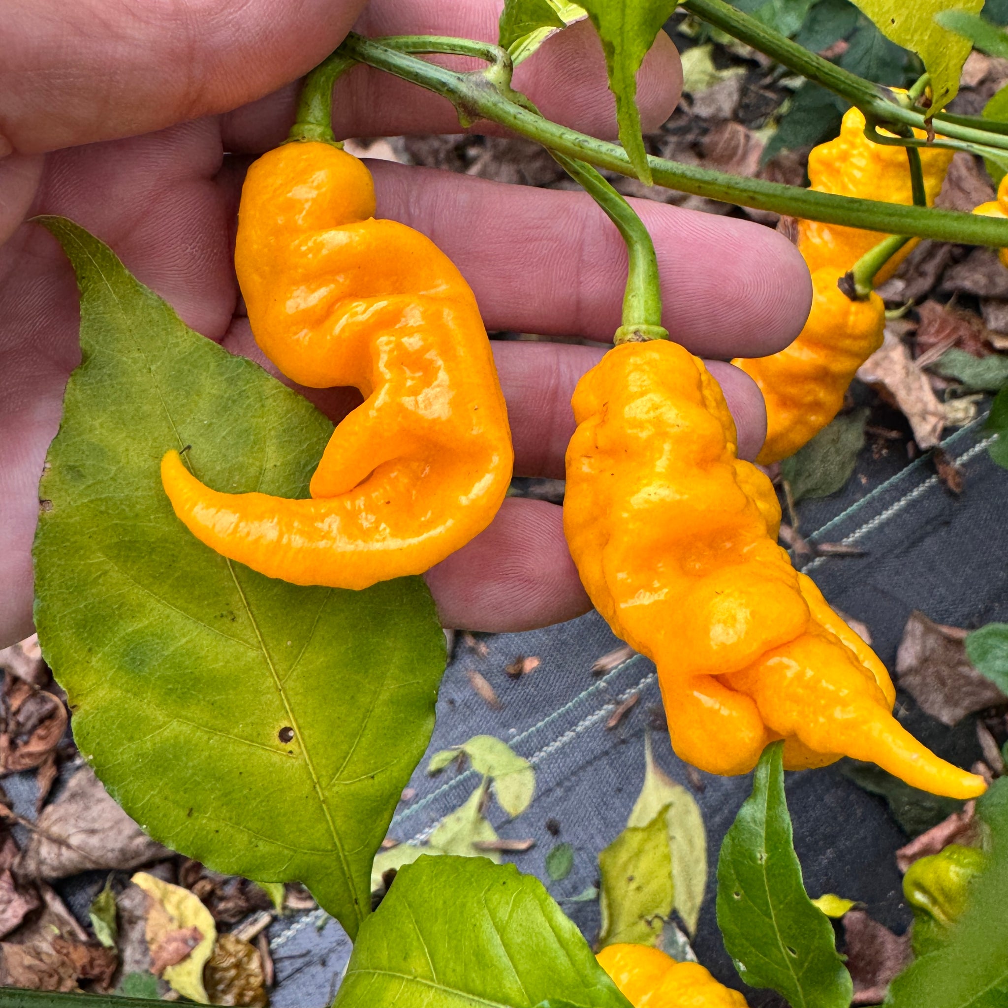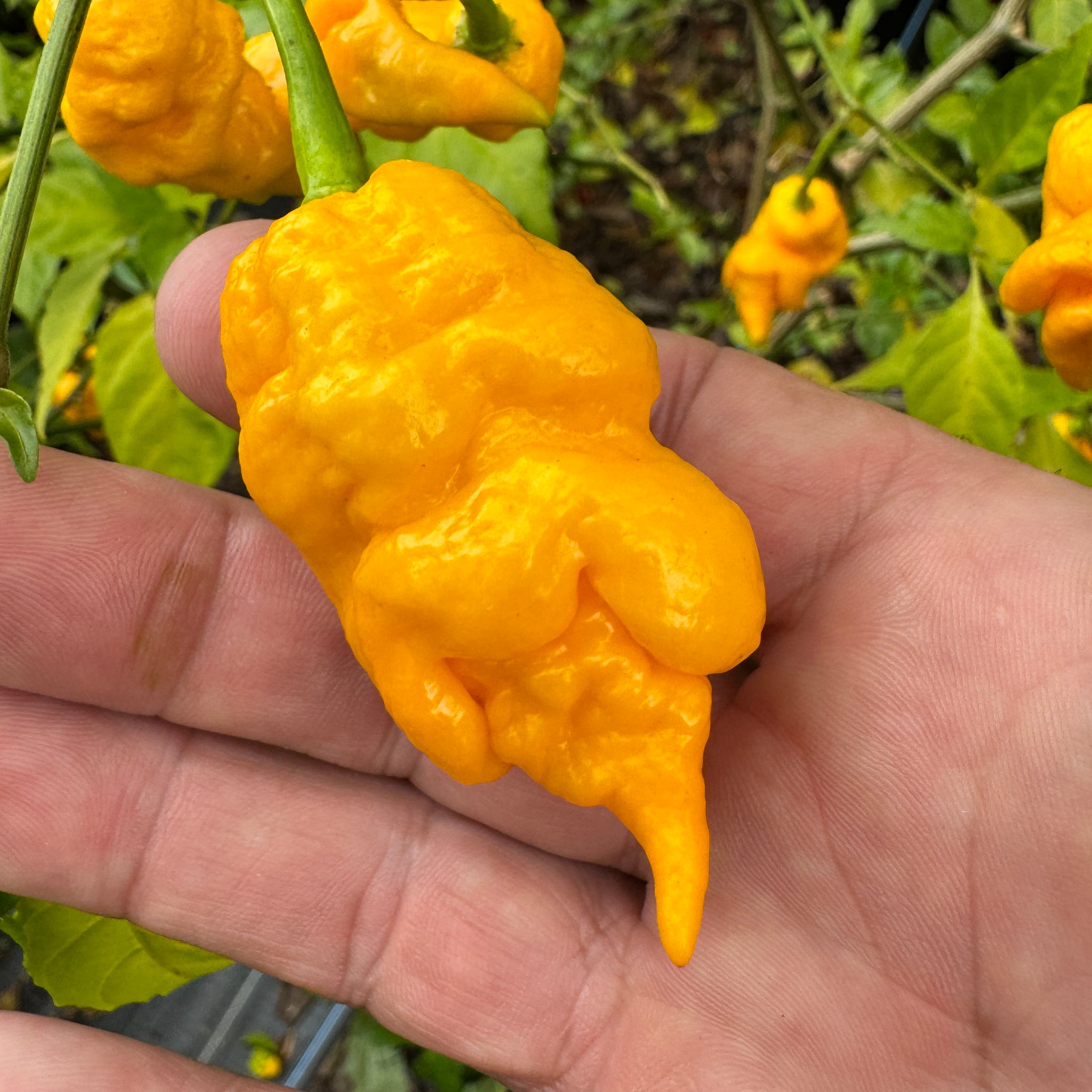 Mantis Claw Yellow is a striking superhot created by Kevin Bane, known for its long, twisted, bumpy yellow pods that resemble a mantis claw. Pod shapes can vary due to its unstable lineage. The heat is intense—often compared to Ghost Peppers—but balanced by a bright, fruity flavor with citrus and light sweetness before a sharp, front-of-mouth burn that fades faster than many superhots. Plants are compact, bushy, and highly productive. Excellent for drying, powders, and hot sauce, this variety delivers both eye-catching looks and serious heat.