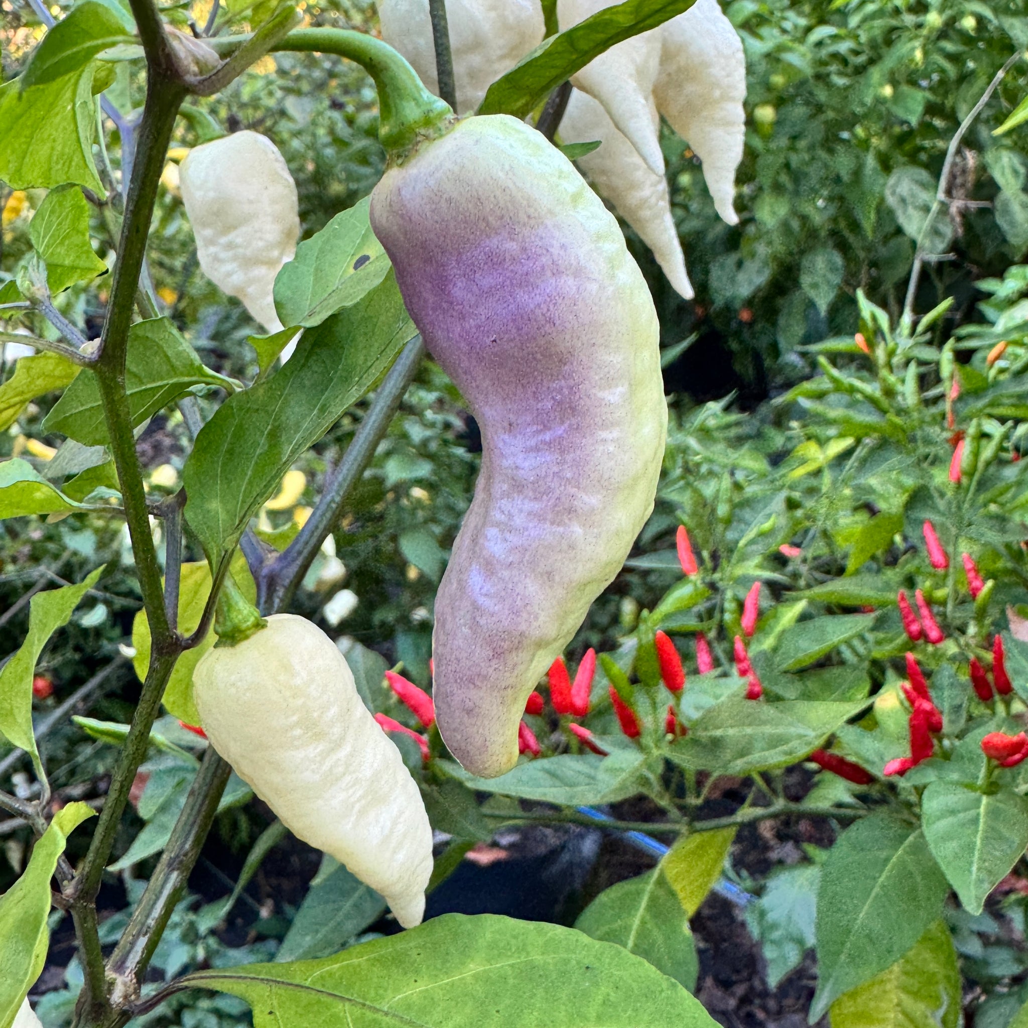 This rare Boar Claw variant came from our Jay’s Peach Ghost Scorpion × Ghost Yaki Purple Orange created by Giancarlo Faddas of Faddas Pepper. This phenotype shows pure green foliage and pods that shift through a stunning color progression. The peppers start green, blush into a soft lavender-purple, and finish as a bright, creamy white. Pods keep the classic Boar Claw shape—long, curved, and textured—with the same sweet upfront flavor and fierce heat. Plants are heavy producers, loading up branches with these unique purple-to-white fruits all season. A gorgeous and flavorful twist on a modern classic, and a must-grow for collectors who love unusual color-changing superhots.