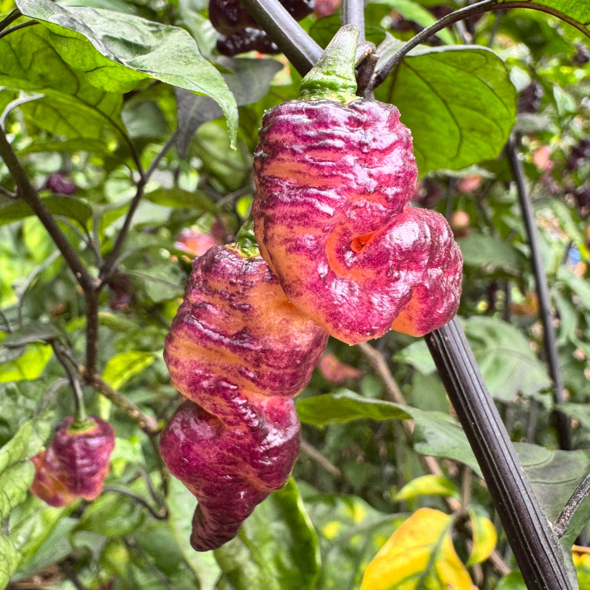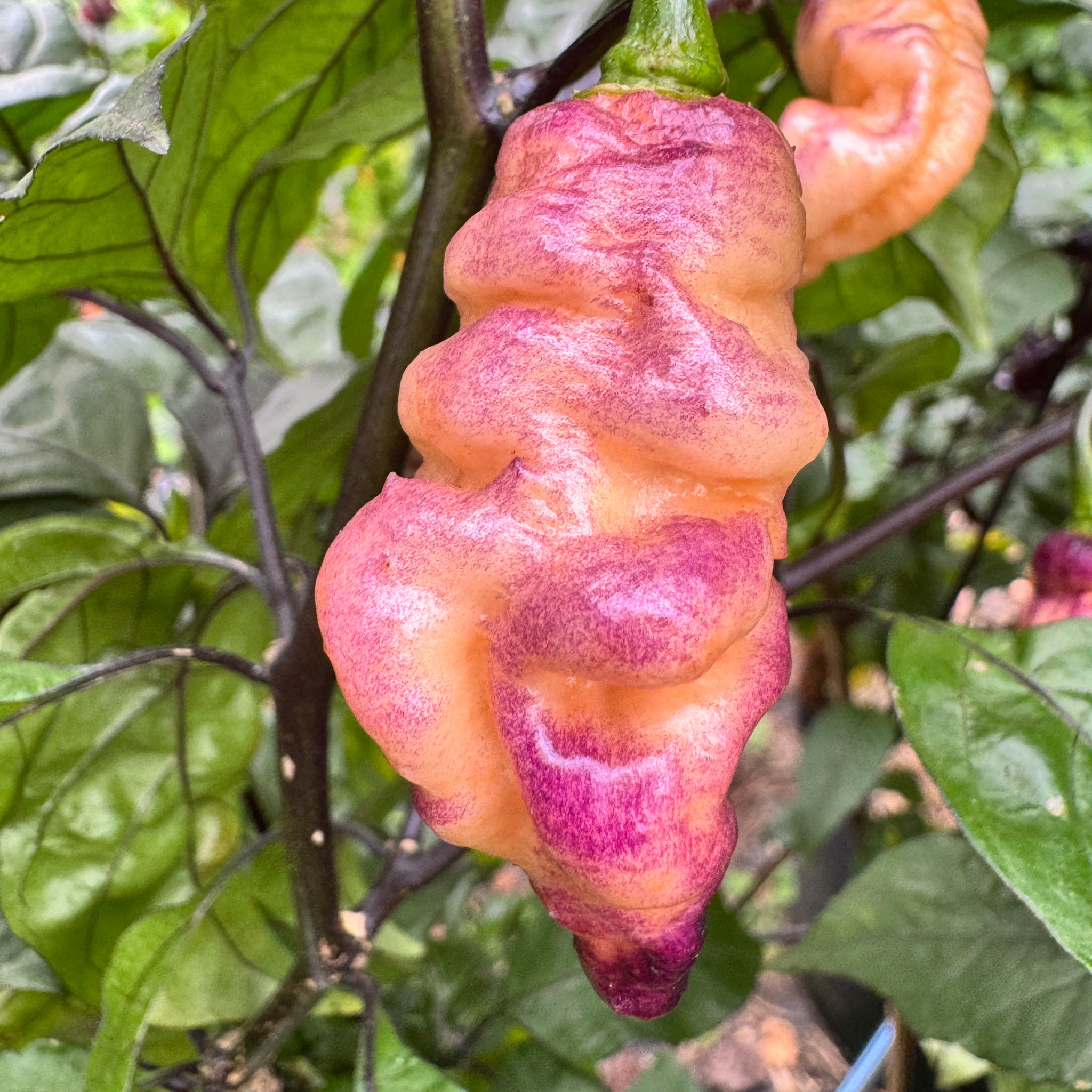Thor’s Thunderbolt is a fierce hybrid from North Queensland, Australia, famous for its jagged, lightning-bolt pods and dramatic color shift from deep purple to pinkish tones, then into a peach- or orange-cream finish. Plants grow medium to large with dark purple-black foliage, producing heavy yields of thin-fleshed, bumpy peppers about 2" long, similar in shape to ghost-type chiles. Flavor is fruity, floral, and lightly citrusy, sometimes with a brief bitter edge before the heat kicks in. It delivers intense fire without entering full superhot territory. Excellent for sauces, pickling, roasting, or powders, Thor’s Thunderbolt is a visually striking and fiery variety perfect for growers who appreciate heat and drama.
