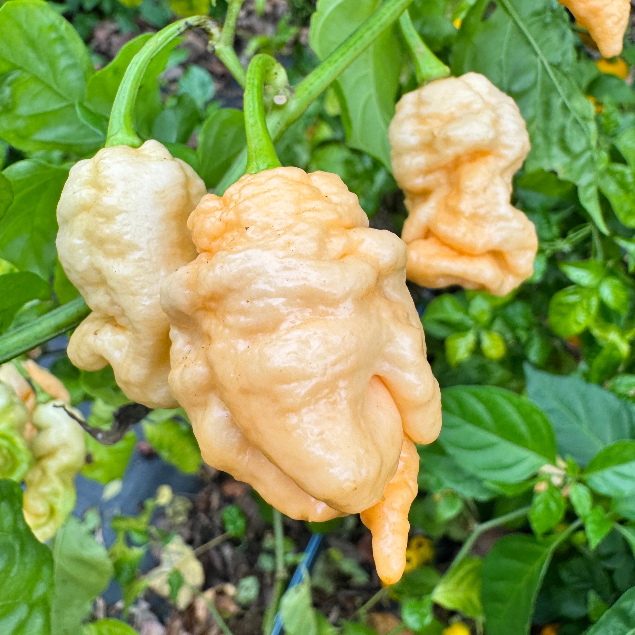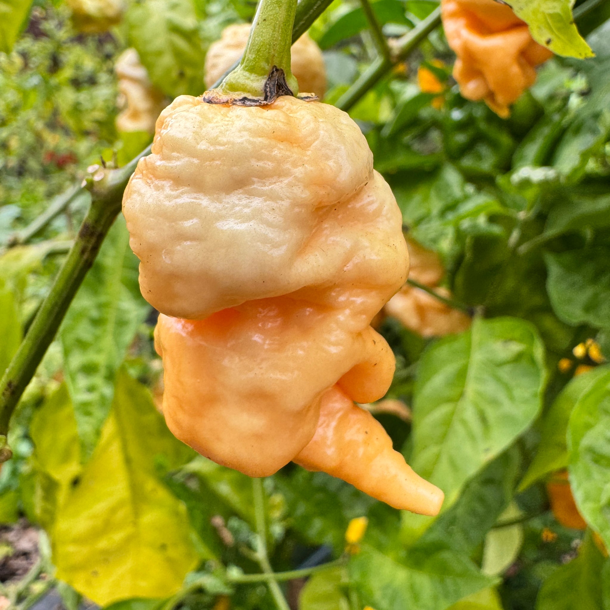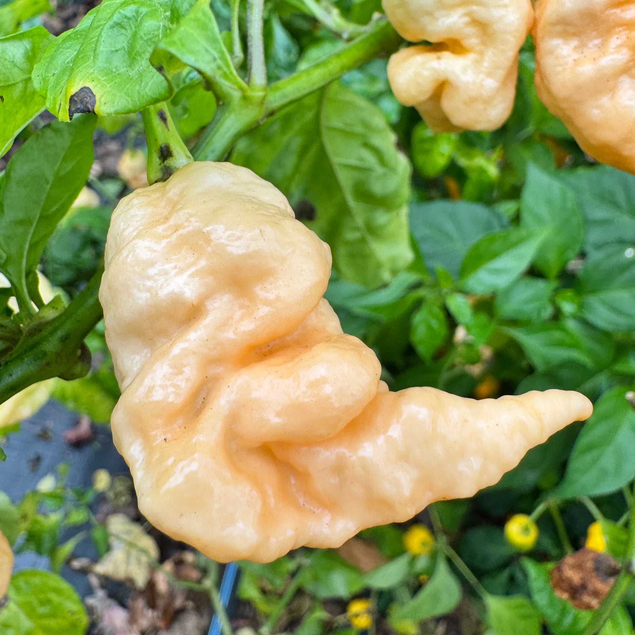 Star Scream is an extreme peach-colored superhot created by grower James Mallon, crossing Jay’s Red Ghost Scorpion with Yellow Carolina Reaper. This variety delivers brutal heat, aggressive scorpion tails, and heavily bumpy, gnarly pods that ripen from light green to a creamy peach. Plants grow in a classic chinense tree form and are productive despite the intense heat level. As the line matures, pod shapes become more consistent, often showing Reaper-like stingers and thick, textured walls. Heat is very high, firmly in superhot territory, with a fast-building, long-lasting burn. Beneath the fire is a light fruity flavor, making Star Scream ideal for extreme hot sauces, powders, and superhot blends. Late ripening but worth the wait, this is a pepper for experienced growers and serious heat seekers only.
