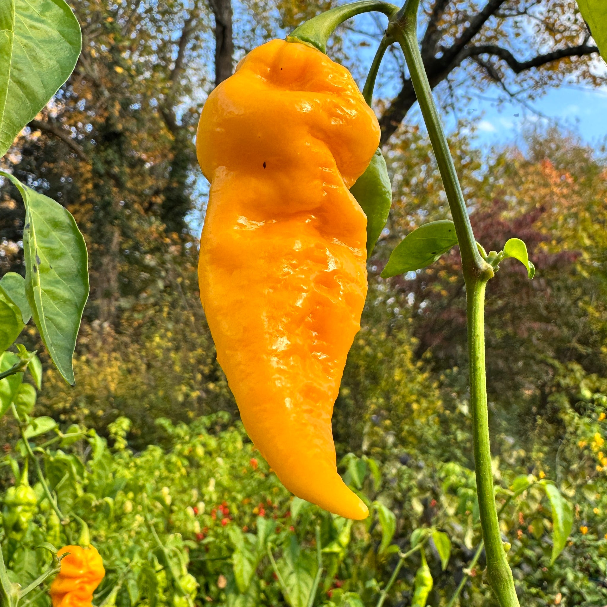 Plants are vigorous and highly productive, filling out with bright yellow fruit that stands out in the garden. Because the cross is still young, shapes and traits can vary, but the flavor and heat remain consistently bold. Excellent fresh, diced into dishes, or cooked into sauces needing a bright, fiery kick.