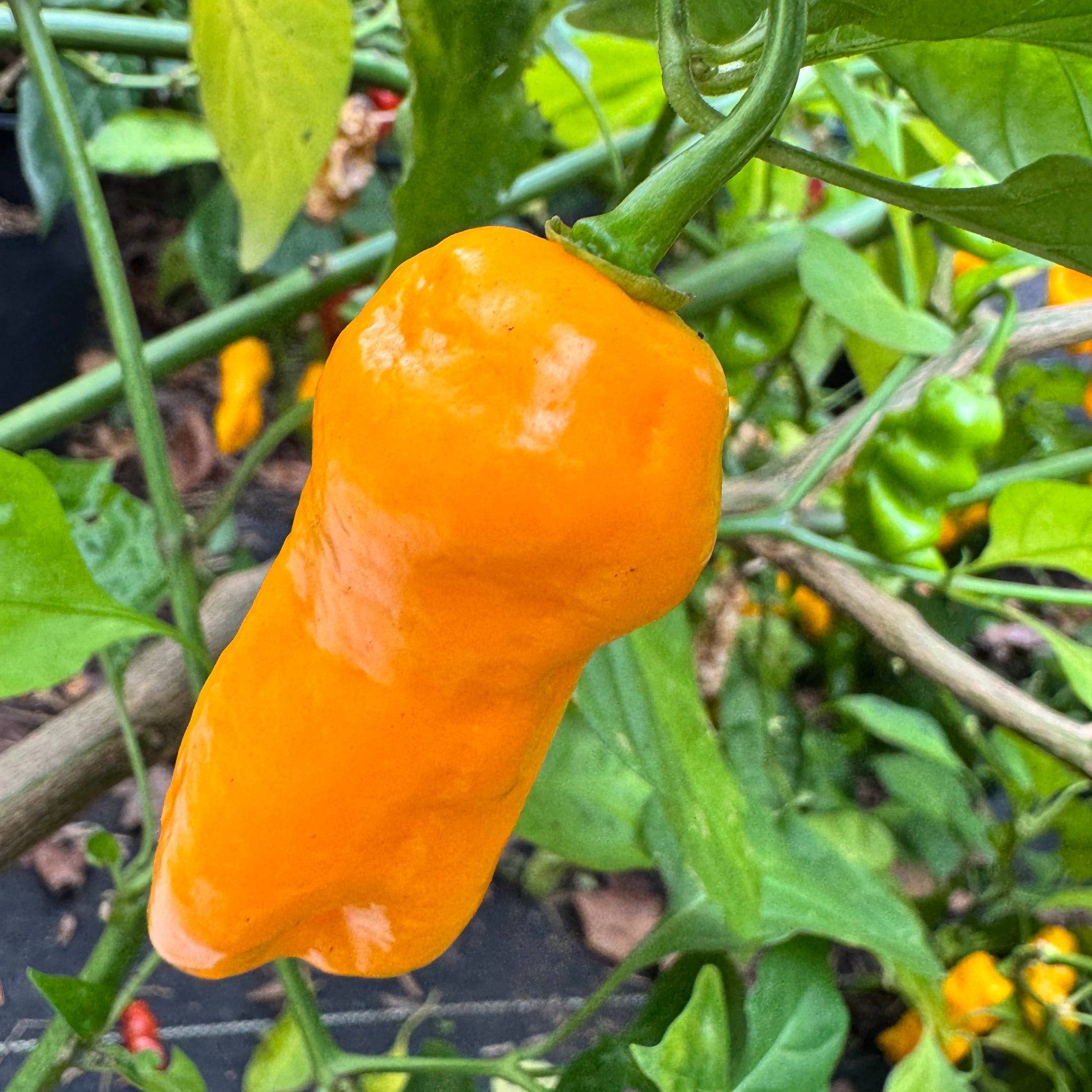 This sunshine-colored firecracker traces its roots to a Scotch Bonnet lineage, but it’s taken on a personality all its own. The pods usually stretch into sleek, tapered shapes around three inches long, though every now and then you’ll spot a plumper, rounder fruit—like the plant briefly remembering its bonnet heritage before changing its mind. Expect a punchy heat that sits comfortably in the upper habanero range, paired with a bright, zesty citrus snap that makes it shine in fresh sauces and salsas. The plants themselves are impressive giants, shooting upward beyond five feet and producing a steady crop of golden pods that look innocent… right up until they bite back.